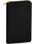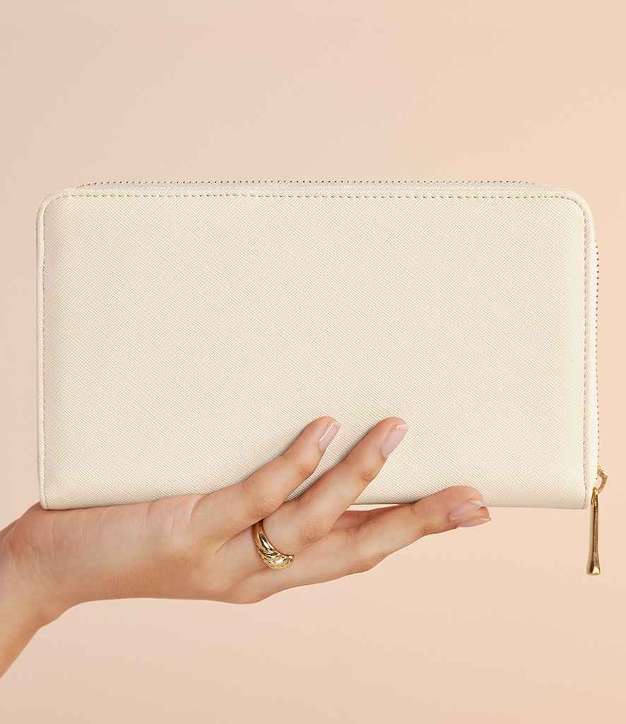 Saffiano fine grain. Protective velvet lining. High shine gold metal zip closure. Two internal secure zip pockets....
