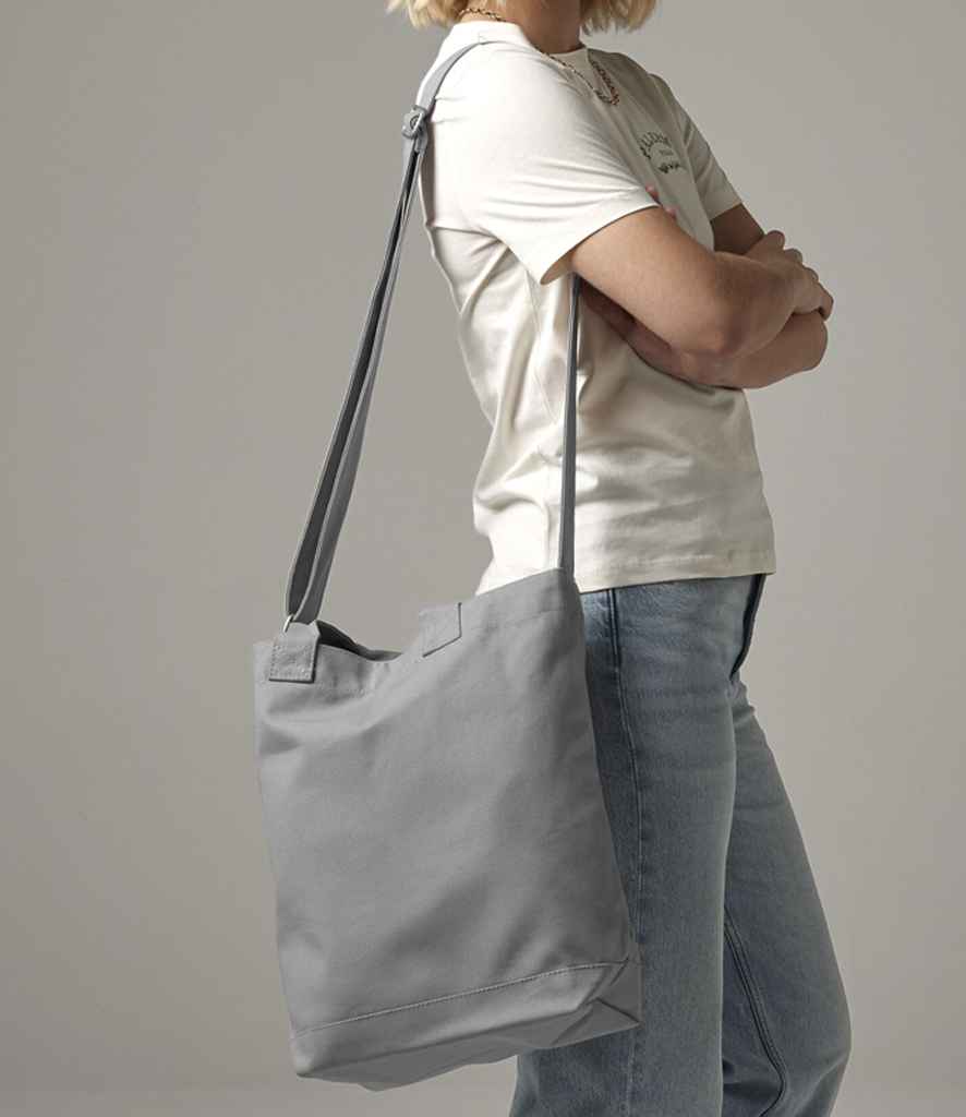 Unisex styling. Carry handles 37cm long . Adjustable self fabric shoulder strap. Press stud closure. Internal valuables...