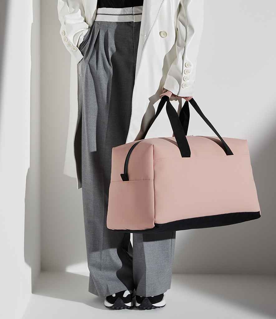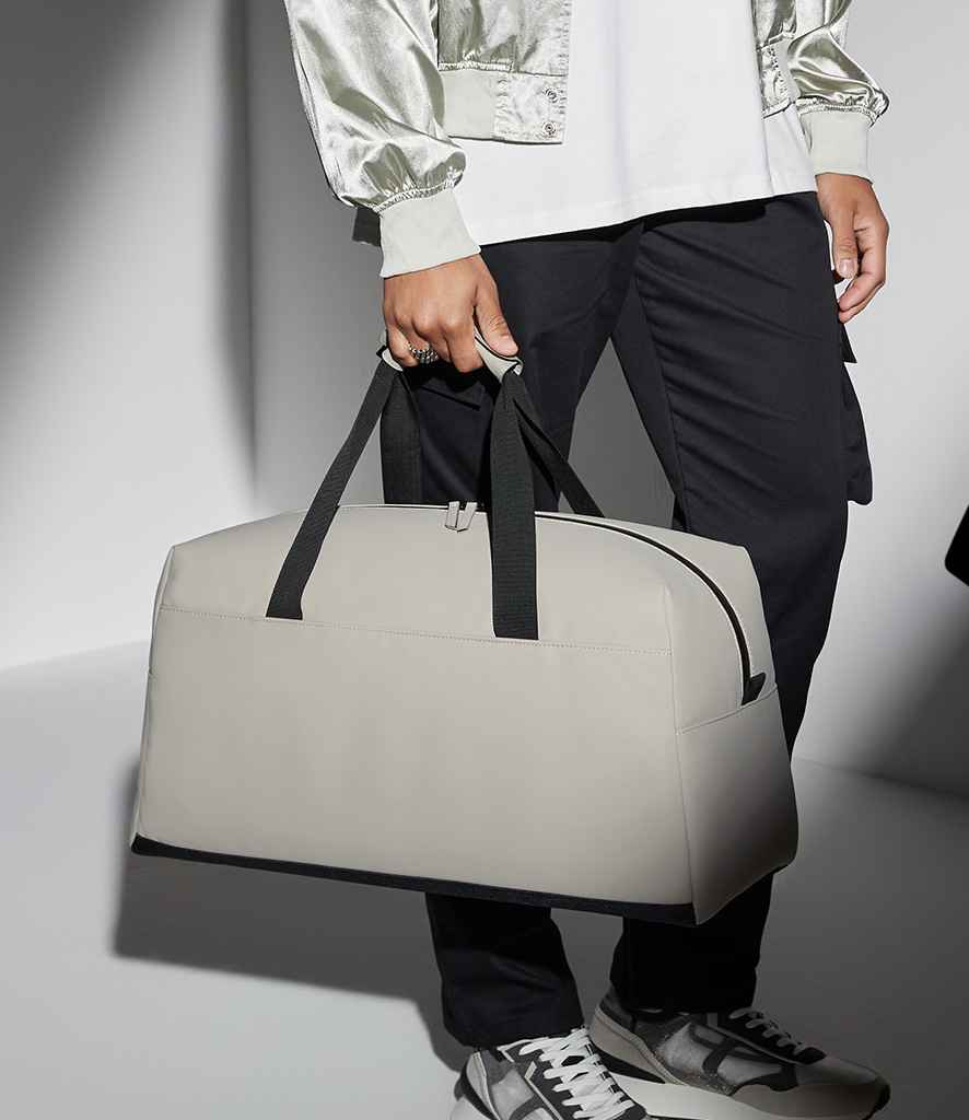 Matte look PU coating. PVC free. Water repellent fabric. Webbing carry shoulder straps. Self fabric handle wrap....