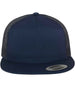 Polyester mesh rear panels. 5 panel. High profile. Structured front panel. Flat peak. Plastic snapback size adjuster....