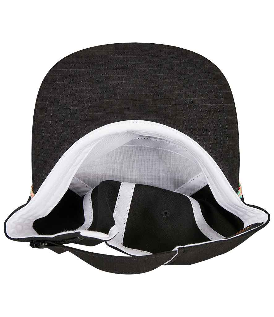 6 panel. Low profile. Stitched ventilation eyelets. Unstructured. Flat peak with contrast braiding. Self colour adjustable strap...