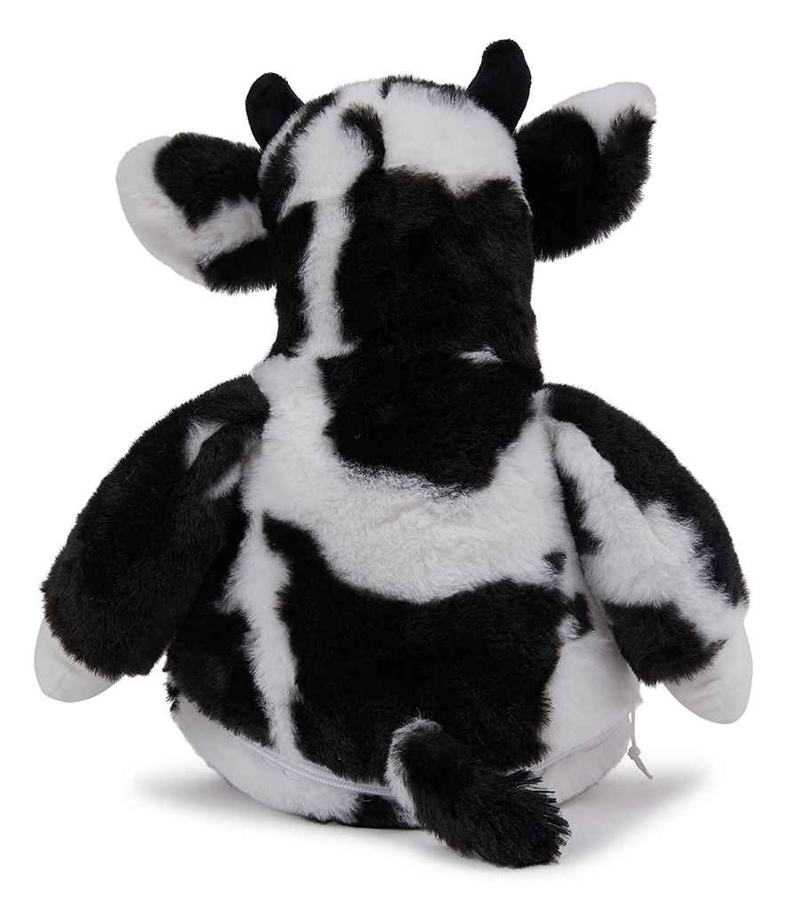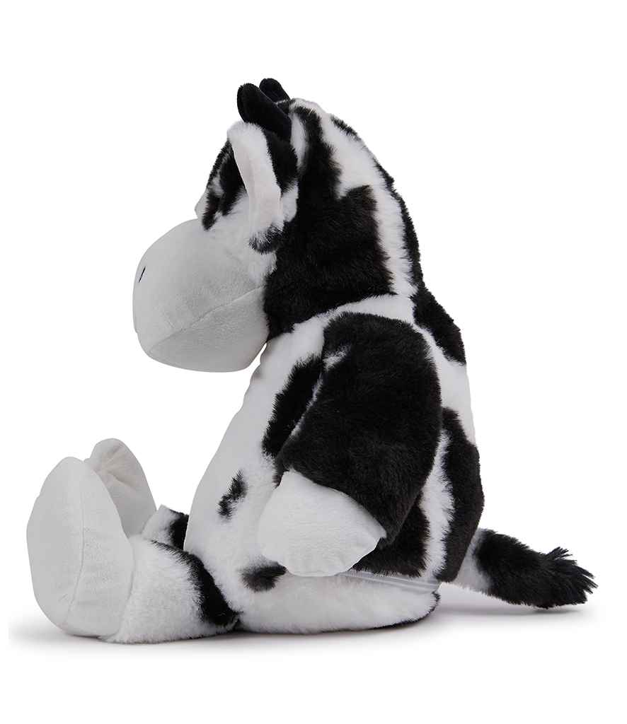 Soft plush black and white cow. Contrast face and hooves. Sewn in eyes and mouth. White colour...