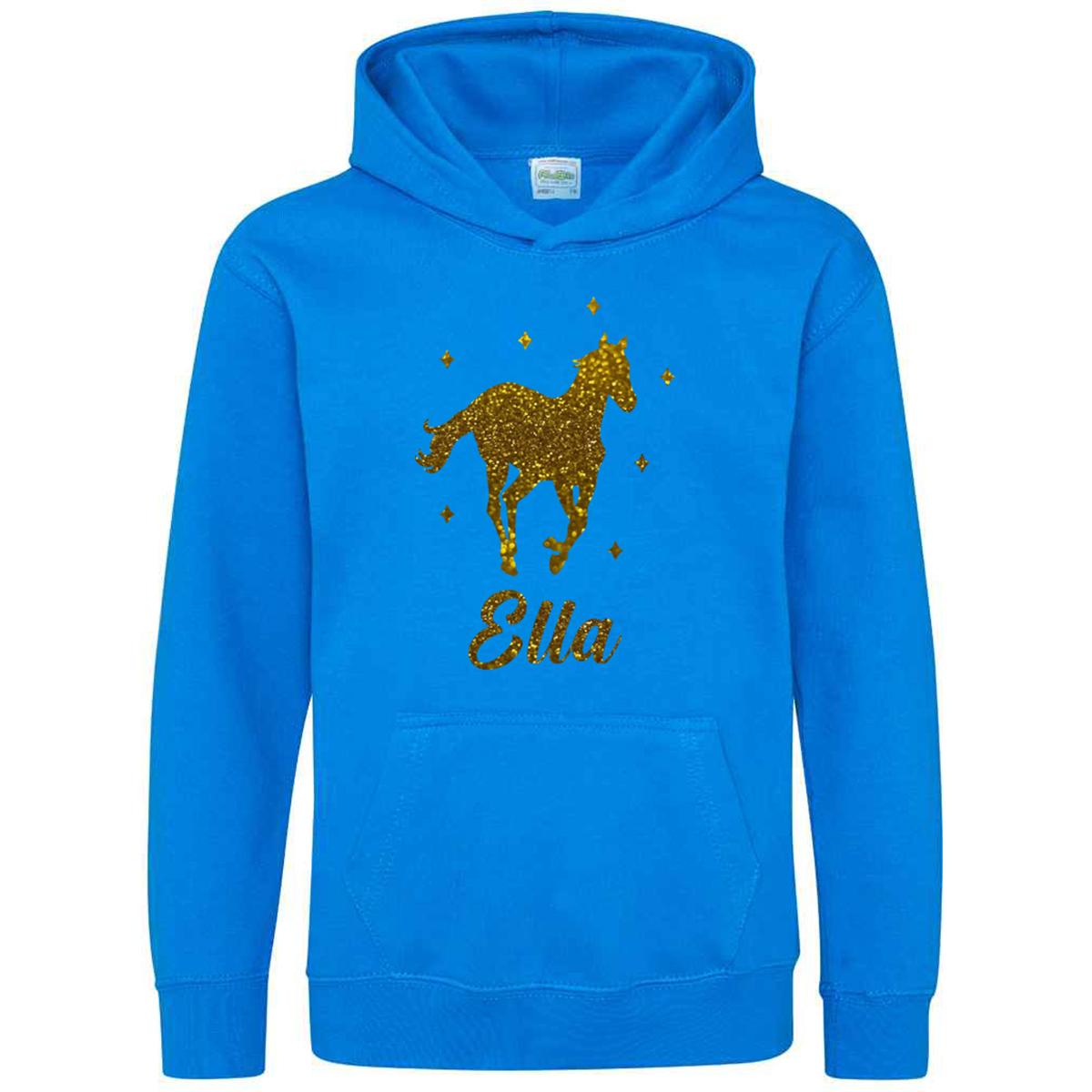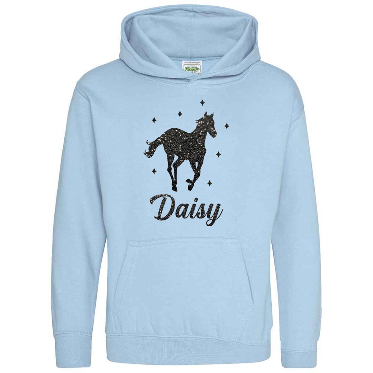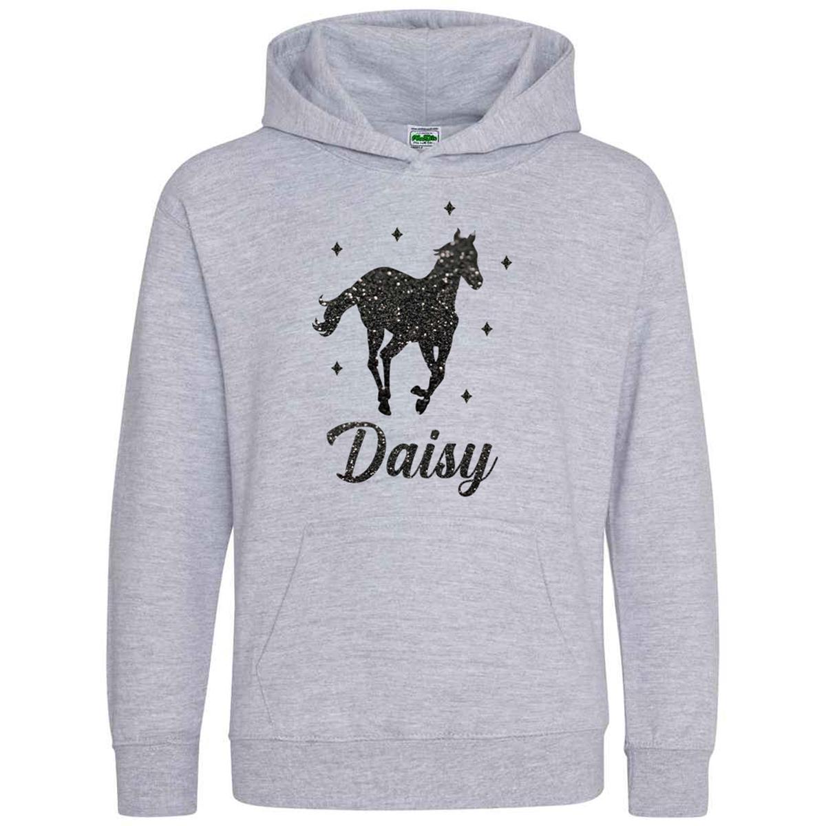 This Personalised Glitter Horse Riding Hoodie is ideal for any casual outfit. Made from 80% ringspun cotton and 20% polyester, it offers a soft cotton-faced fabric. The double fabric hood and no drawcords ensure EU regulation compliance. It provides all-day comfort with its loose-fitting style.
