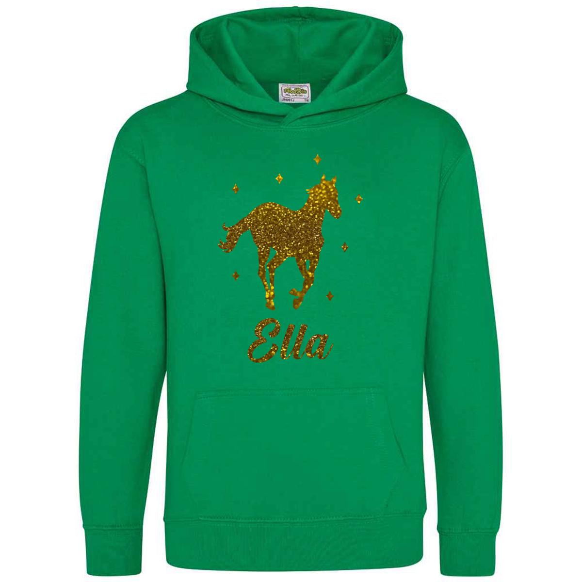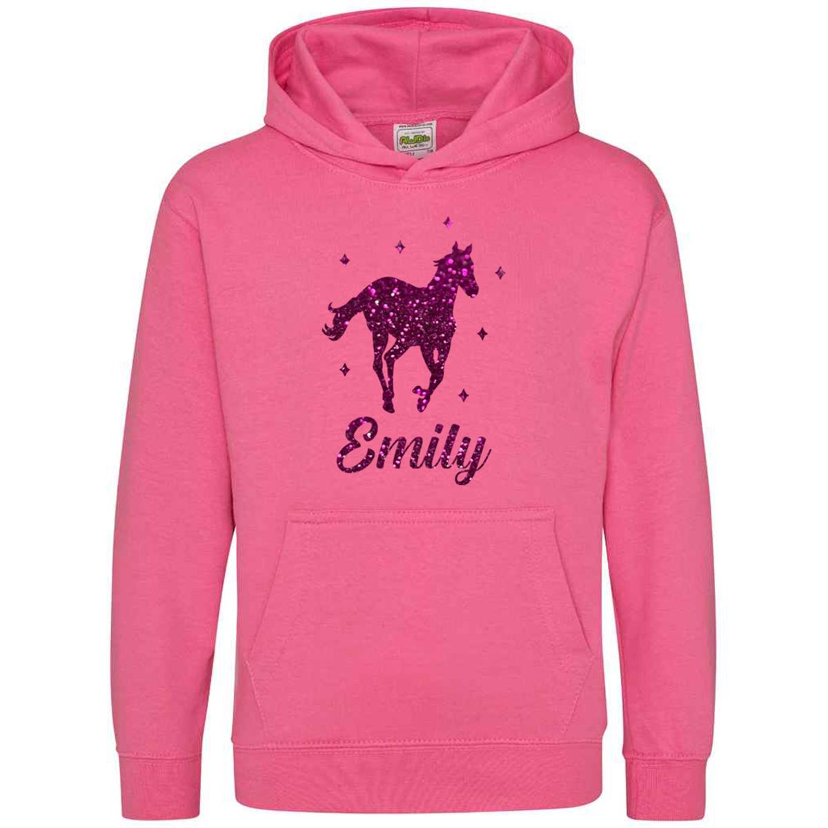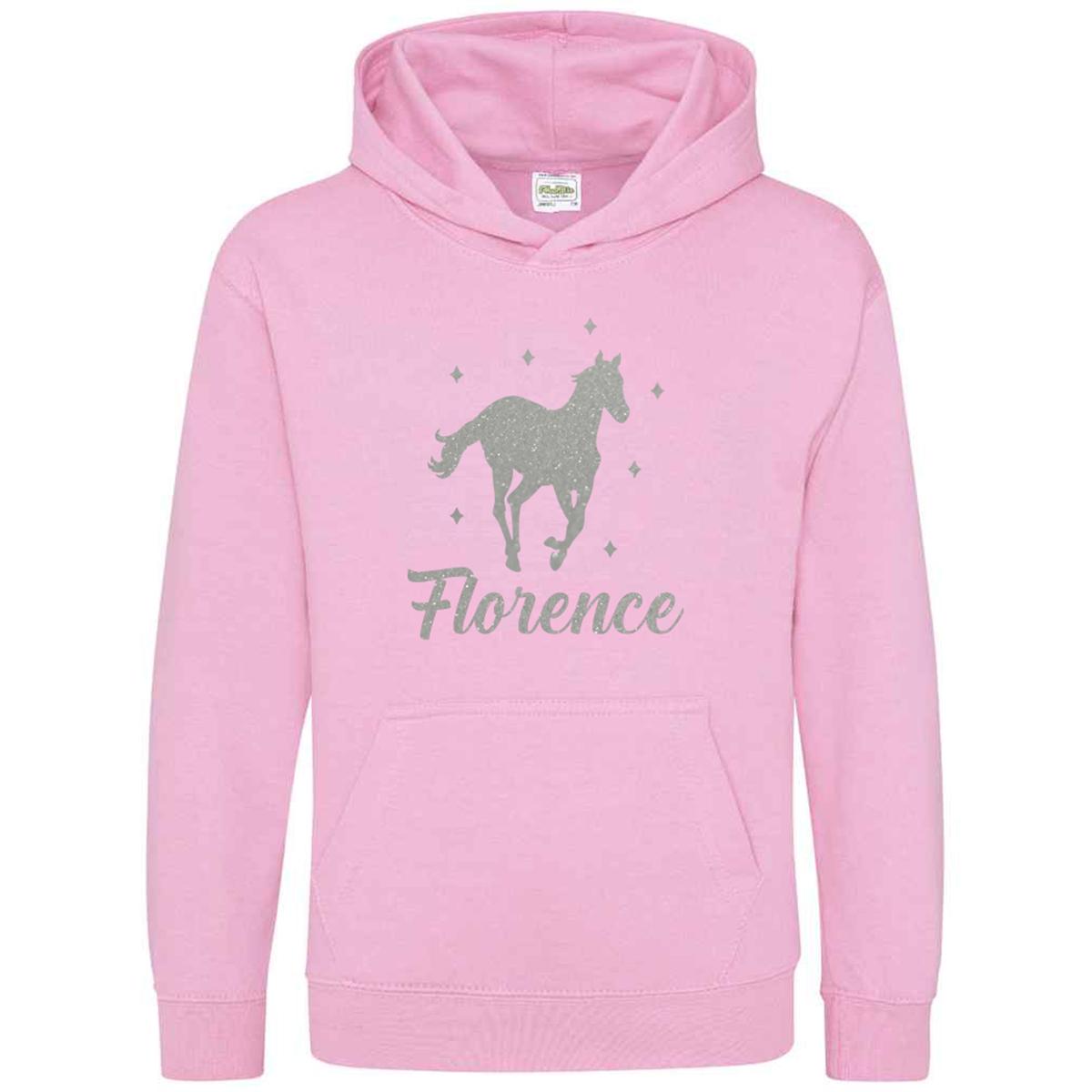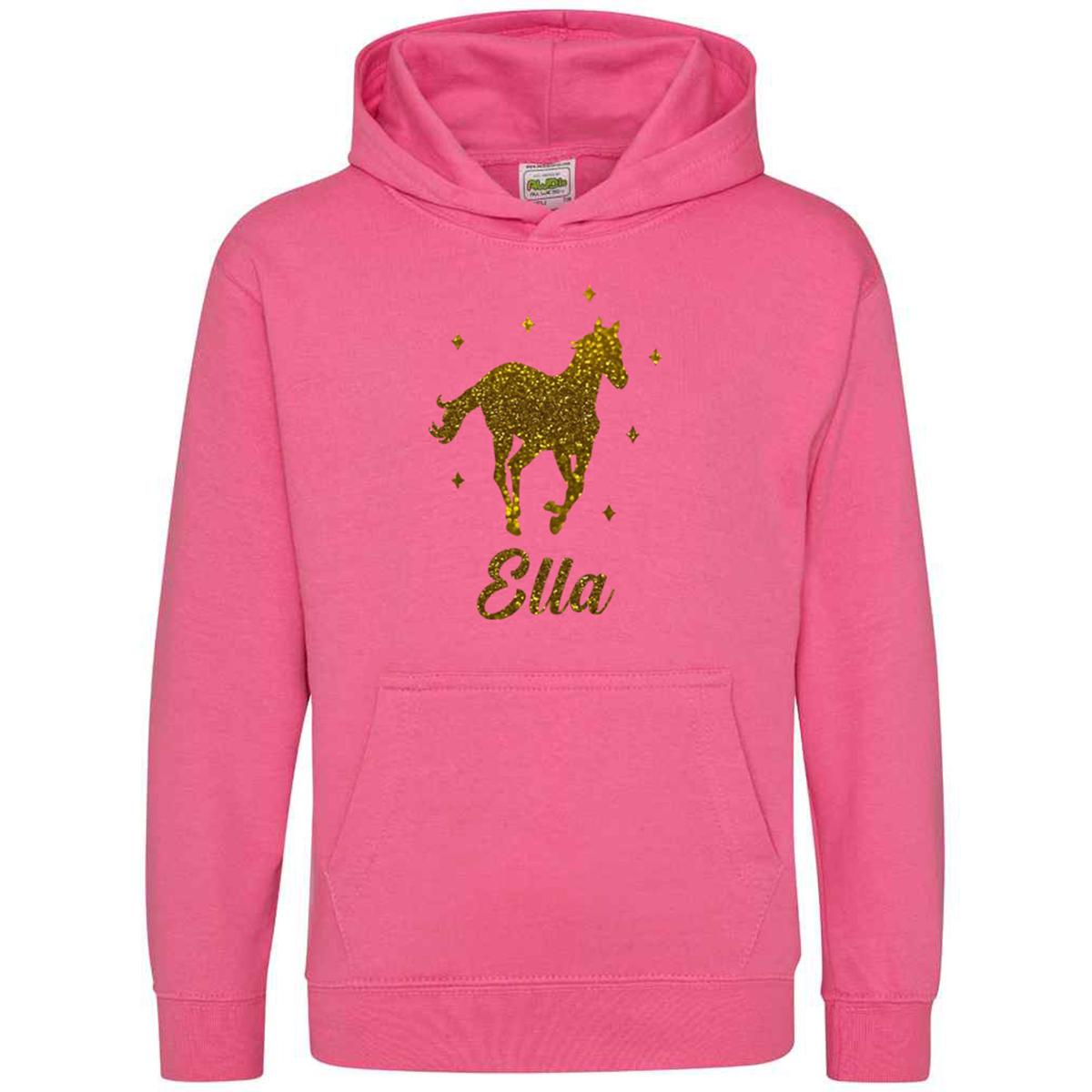 This Personalised Glitter Horse Riding Hoodie is ideal for any casual outfit. Made from 80% ringspun cotton and 20% polyester, it offers a soft cotton-faced fabric. The double fabric hood and no drawcords ensure EU regulation compliance. It provides all-day comfort with its loose-fitting style.