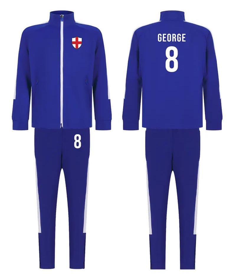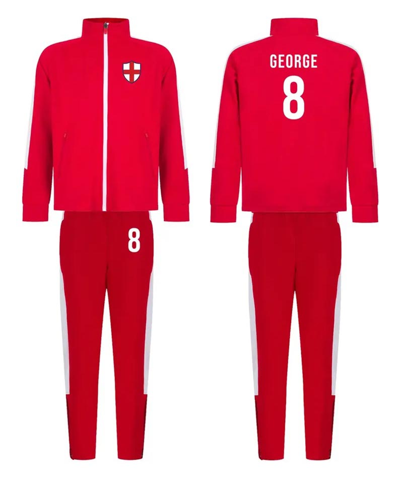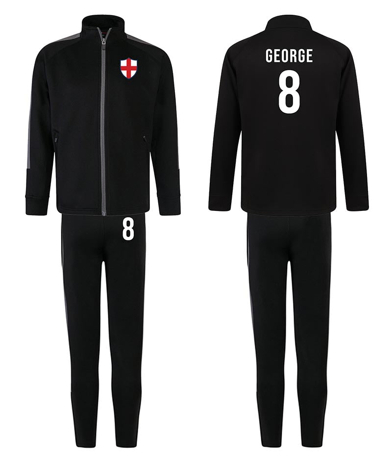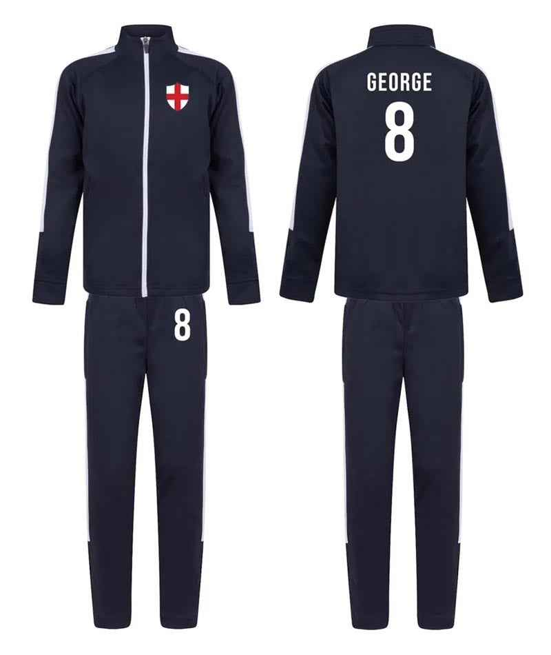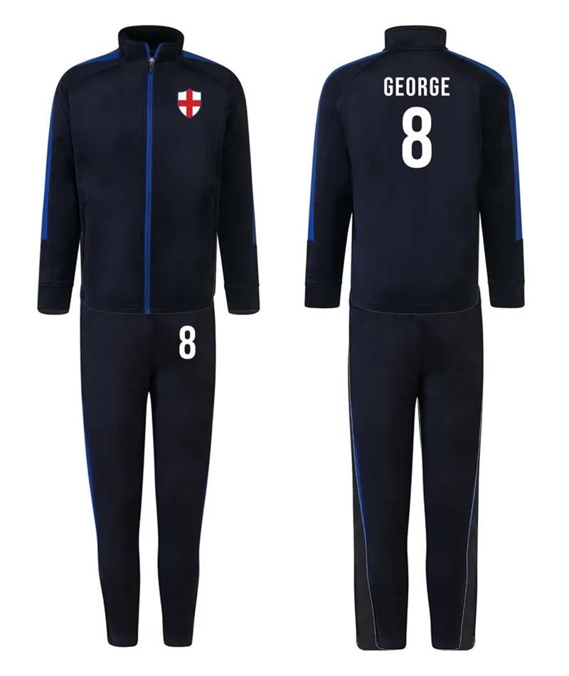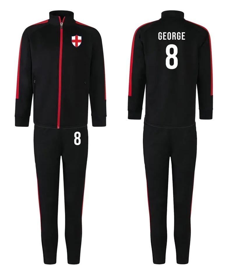 Personalised Kids Sports Tracksuit Zipper Top and Pants, Sport kit Customised Name Print England Flag Names & Numbers for Young Athletes